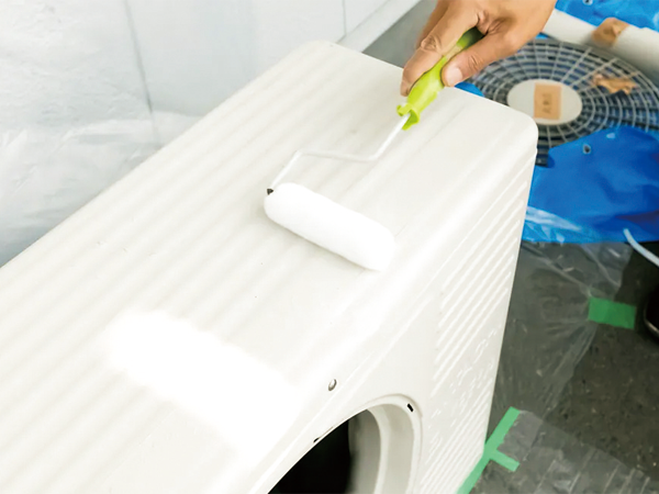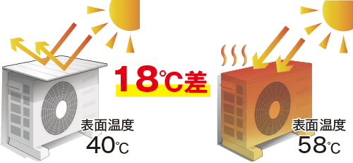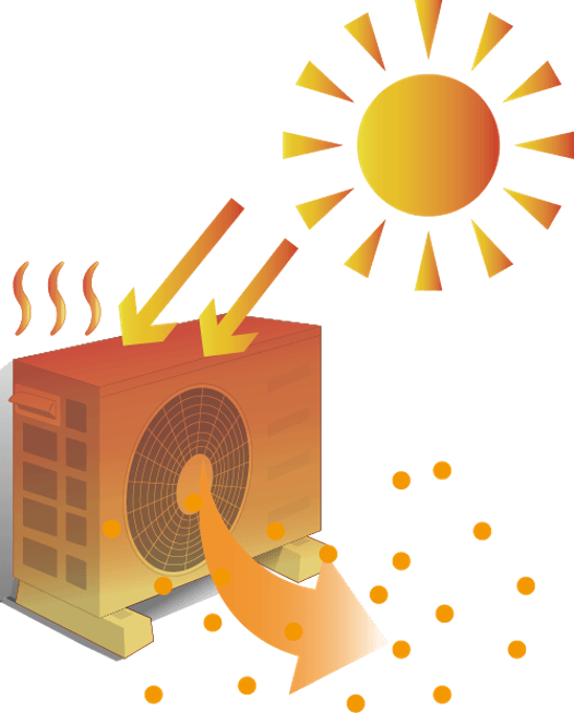 遮熱塗料「テラノペイント」は、室外機の表面に塗布することで、太陽光による熱の侵入を抑え、温度の上昇をやわらかくする方法です。